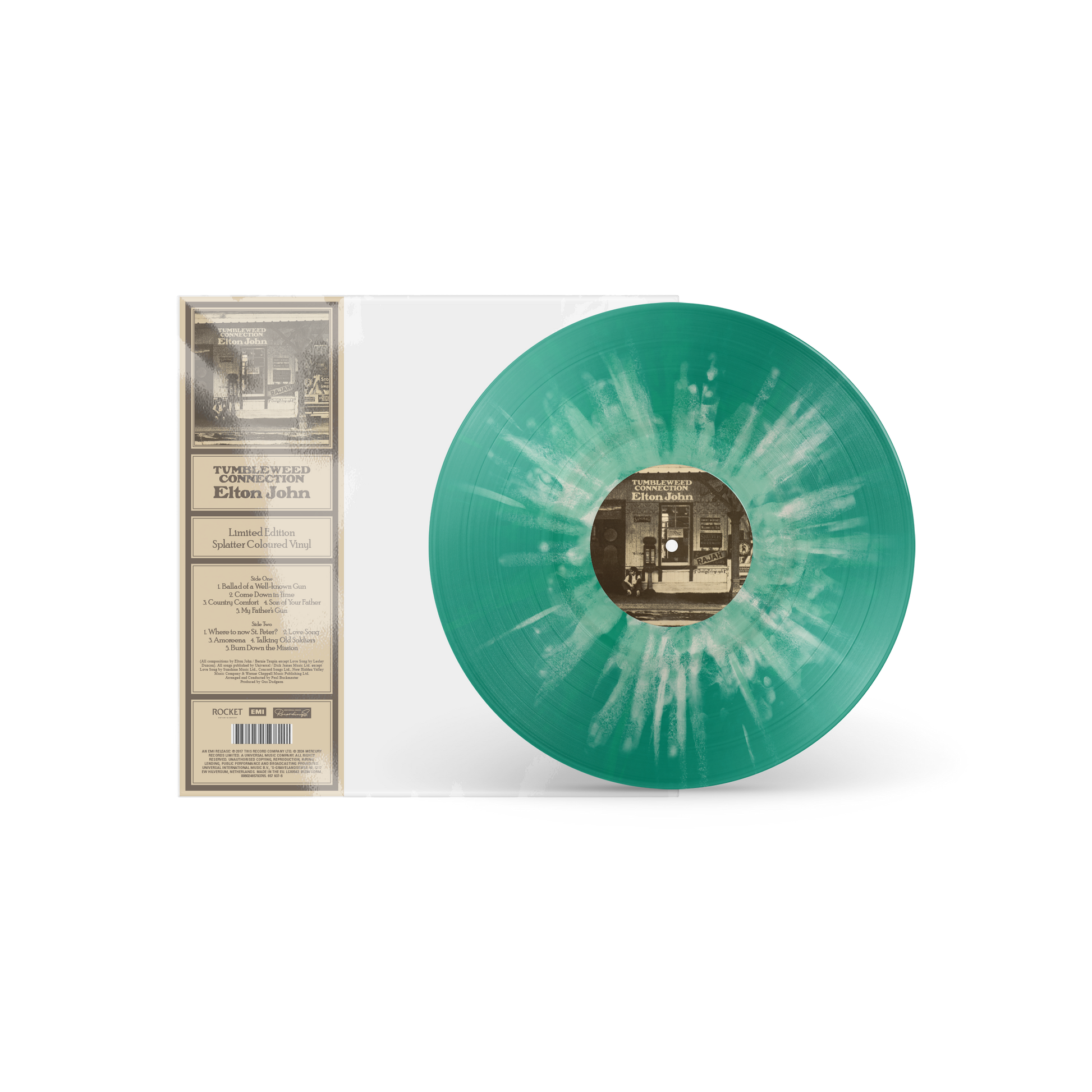 ‘Tumbleweed Connection’ is the third studio album by Elton John. Best known for tracks “Burn Down The Mission” and “Amoreena”, the album was recorded at Trident Studios, London, England in March 1970 and released in October of the same year. 1LP hand-pressed on limited edition green splatter vinyl, housed inside a clear PVC sleeve with backing card and obi strip. Remastered in 2017 by Bob Ludwig and cut at Abbey Road Studios.